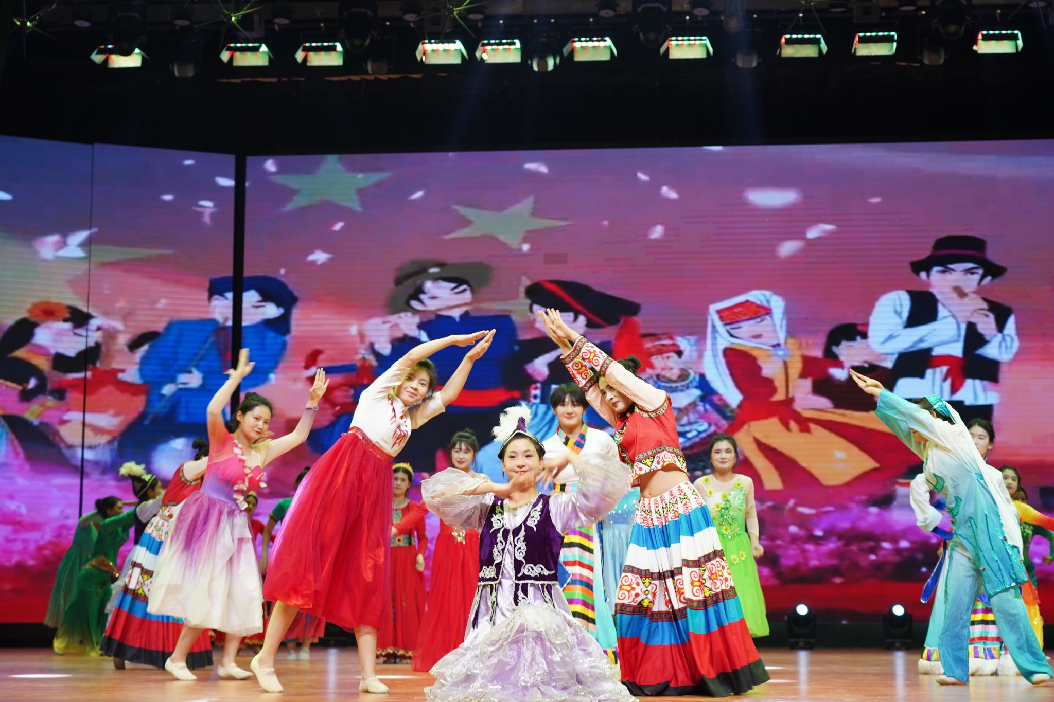 晚会在充满活力的《中华民族一家亲》舞蹈中热烈开场。随后,第一篇章“粤新共济·情满天山”深情展开,经典旋律《再唱山歌给党听》与诗朗诵《致敬,援疆的您》相映生辉,真挚抒发了对党的无限热爱及对援疆事业的崇高礼赞;援疆专家一曲《疆缘》悠扬动人,唱响了粤新两地心手相连、守望相助的深厚情谊;歌曲《援疆医生亚克西》以质朴而热烈的词句,深切讴歌了援疆干部的使命担当与为民情怀,将晚会气氛推向高潮。