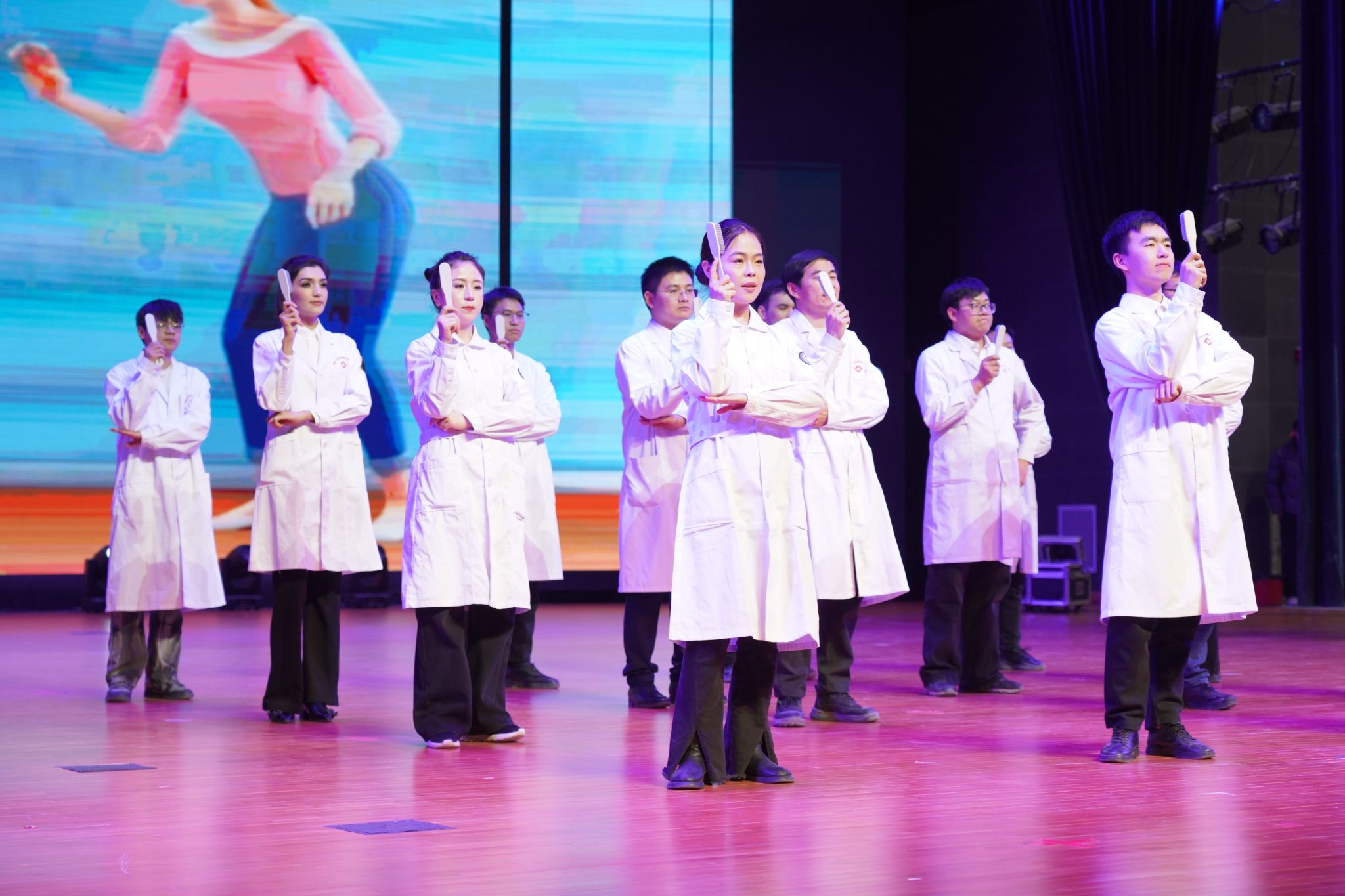 第二篇章“十九华载·医路芳华”中,歌伴舞《生命的光亮》以温暖旋律与动人舞姿,深情诠释医者仁心;随后,第三师图木舒克市总医院成立19周年纪念视频《光阴为证 薪火相传》徐徐展开,以光影交织的叙事,回顾一路走来的坚守与成长,见证薪火相传的医者使命与时代担当;健康教育情景歌舞则以活泼生动的舞台形式,将健康知识融于旋律与表演之中,在欢快的节奏里传递关爱,于情景交融中普及常识形式新颖,深入人心。