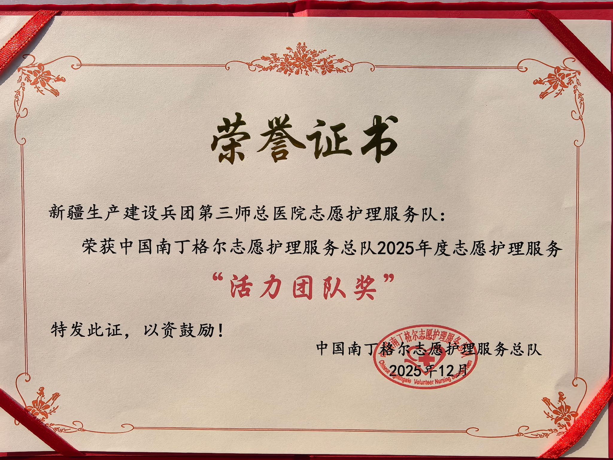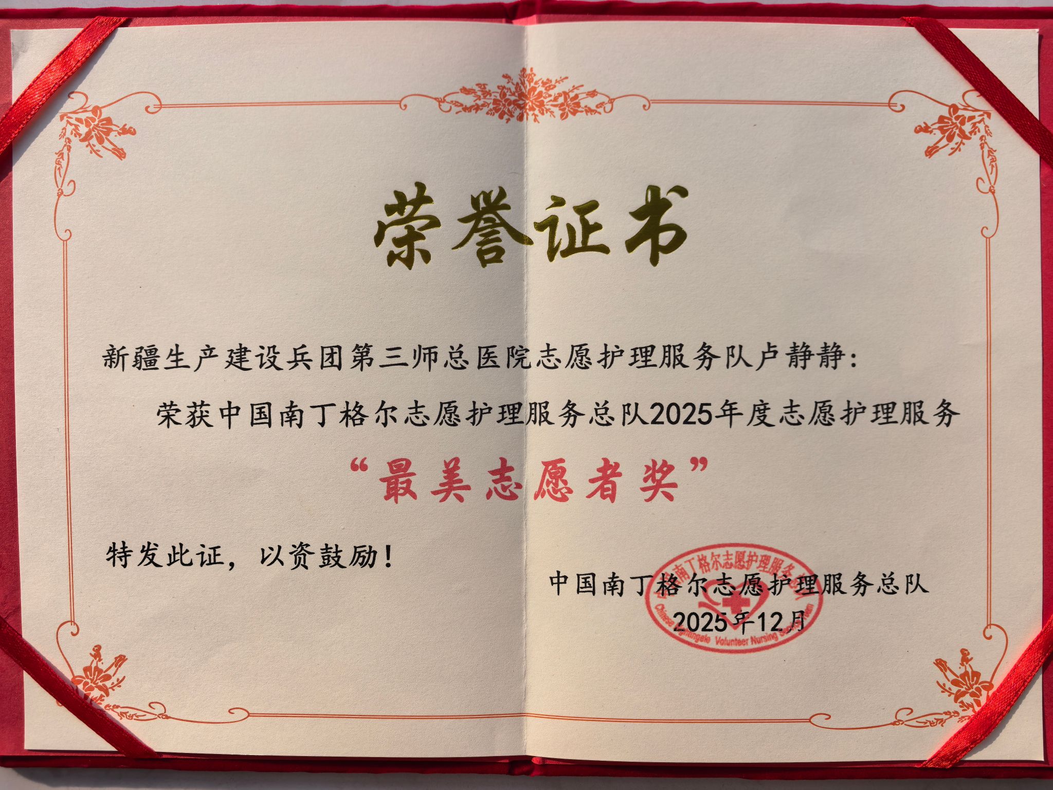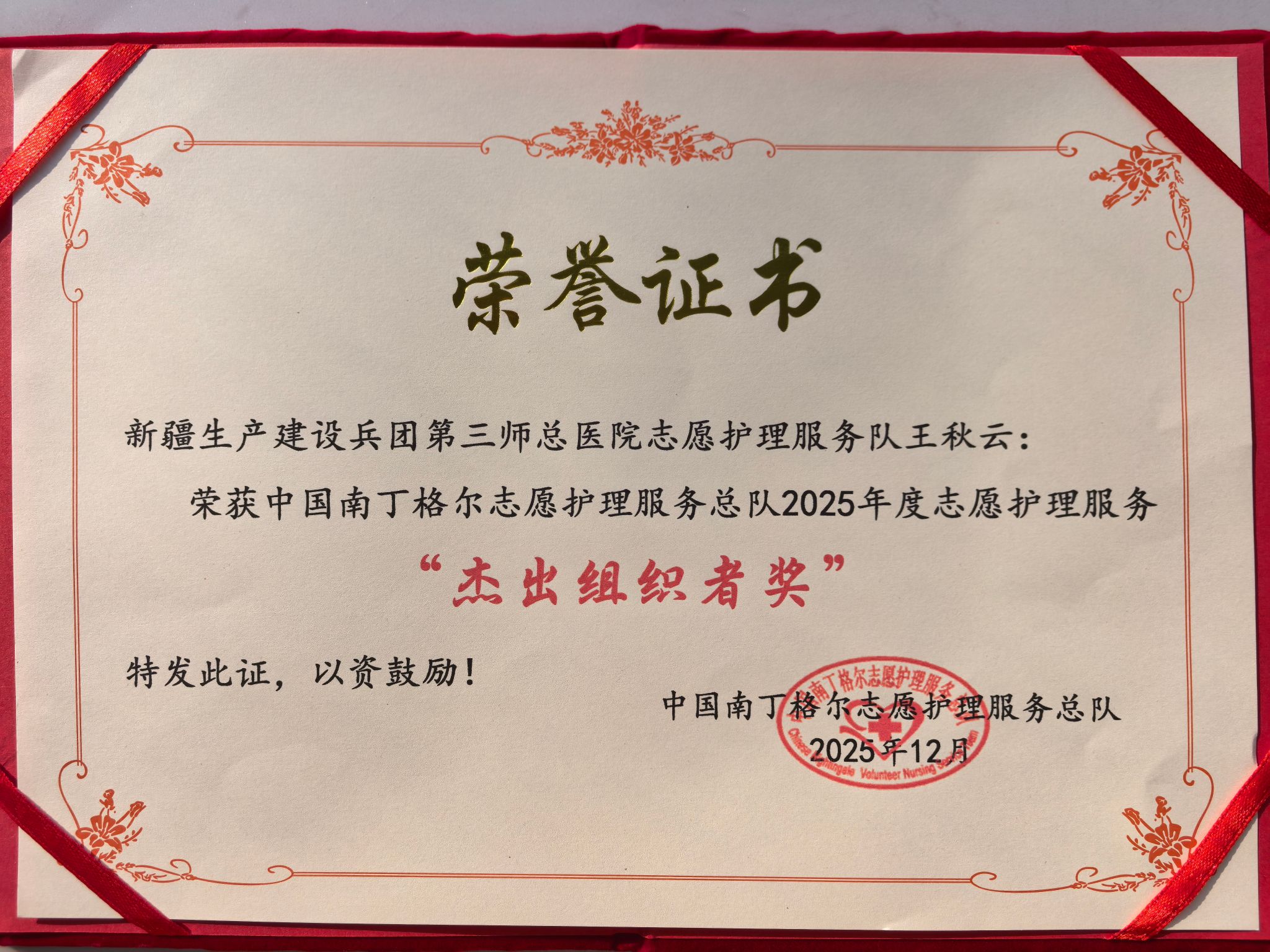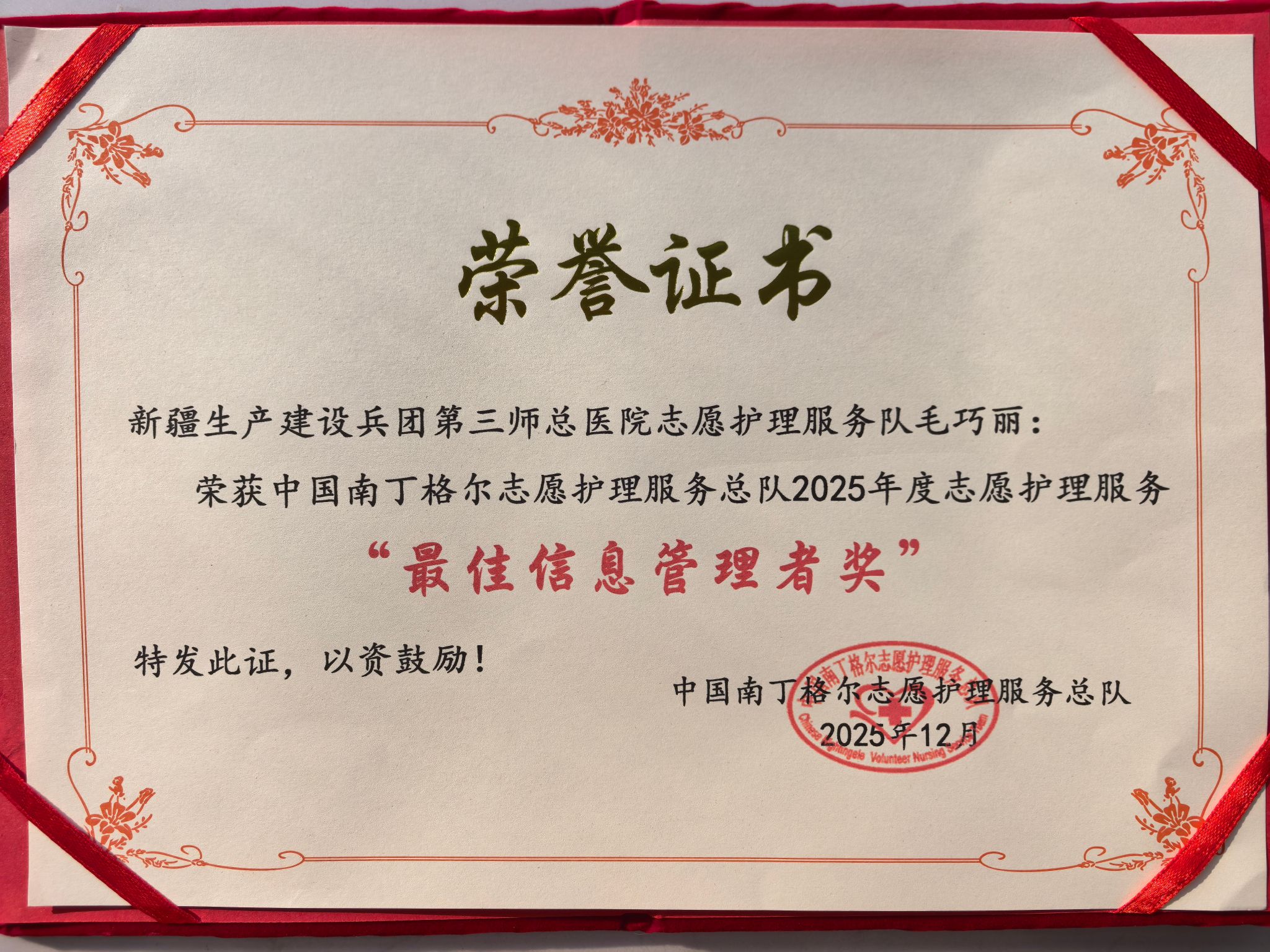 近日,第三师图木舒克市总医院南丁格尔志愿护理服务队在2025年度中国南丁格尔志愿护理服务总队考核评选中表现突出,在全国1081支队伍中综合排名第66位,并一举荣获总队颁发的“活力团队奖”“杰出组织者”“最美志愿者”“最佳信息管理者”四项荣誉称号。