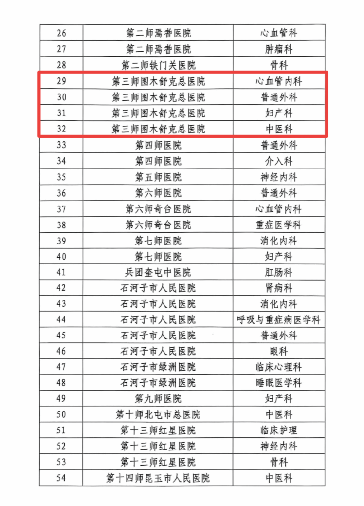 近日,兵团卫生健康委发文正式公布“十四五”第二批兵团临床重点专科名单。第三师图木舒克市总医院心血管内科、普通外科、妇产科、中医科四个专科实力登榜!