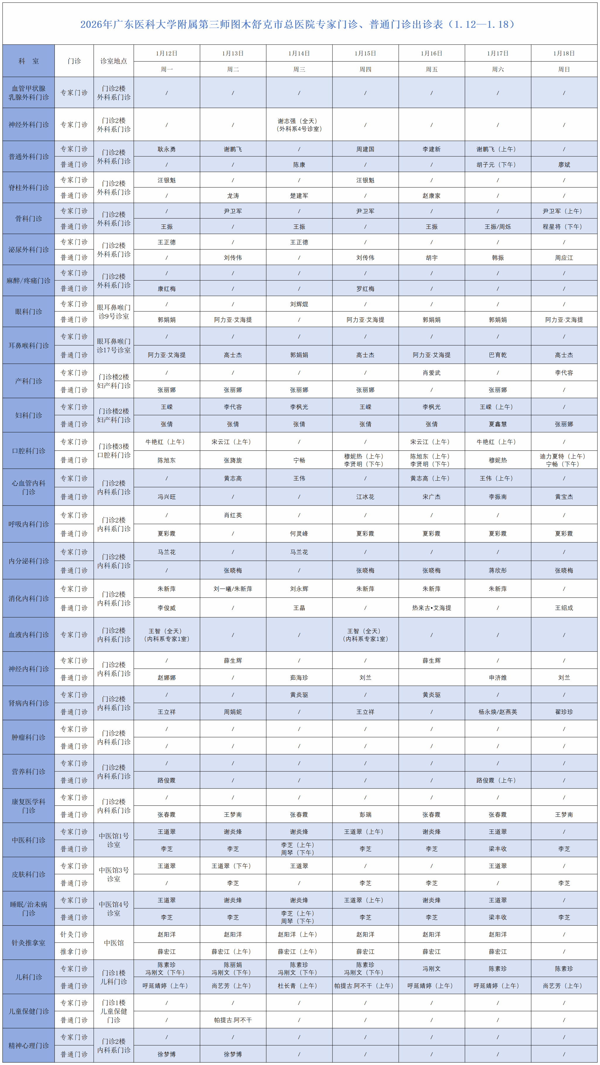 2026年1月12日—2026年1月18日医院专家门诊、普通门诊出诊表